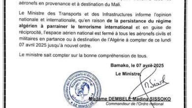 قررت الحكومة المالية غلق مجالها الجوي في وجه الملاحة الجوية الآتية من الجزائر أو المتوجهة إليها وهذا ابتداء من اليوم…